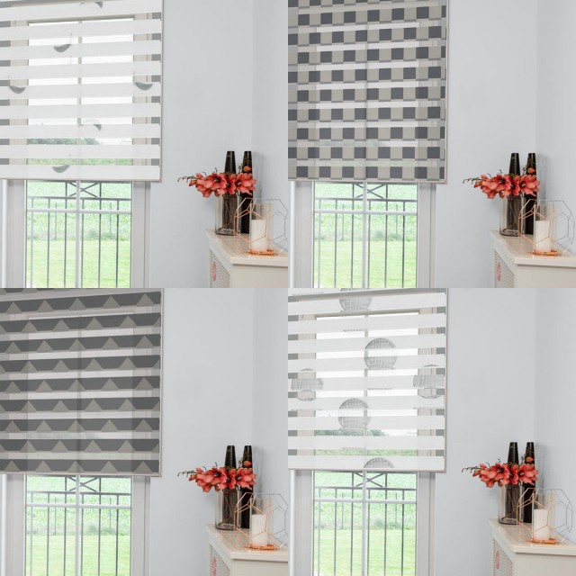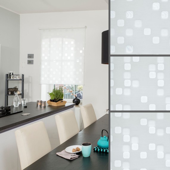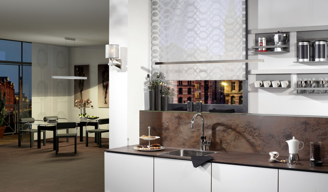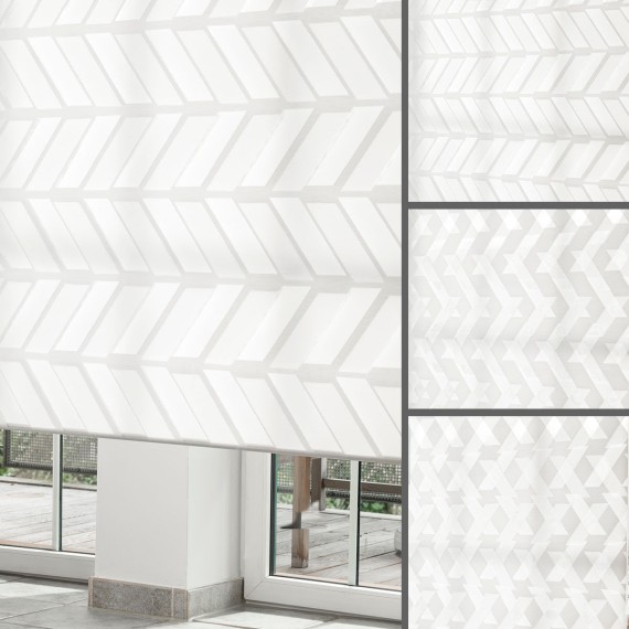 Streifensegmenten, lässt sich der Durchblick individuell regulieren. Der doppelt ge-geneinander laufende Behang ermöglicht verschiedene Transparenzen von Durch-sicht, leichter Transparenz bis zum funktionellen Sicht- und Lichtschutz.